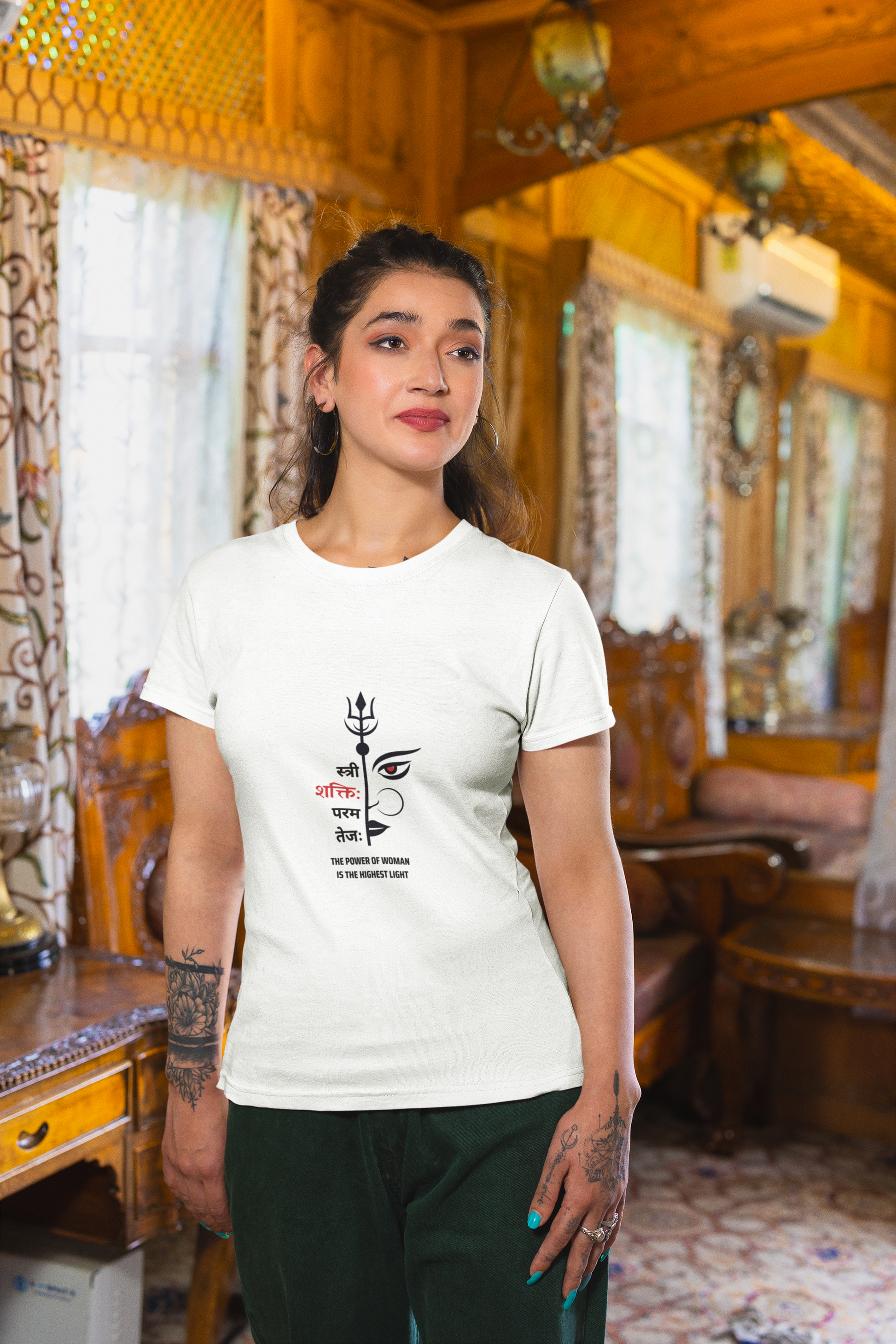 स्त्री शक्ति परम तेजा — Women’s Classic Crew T-Shirt (Sanskrit) (White)