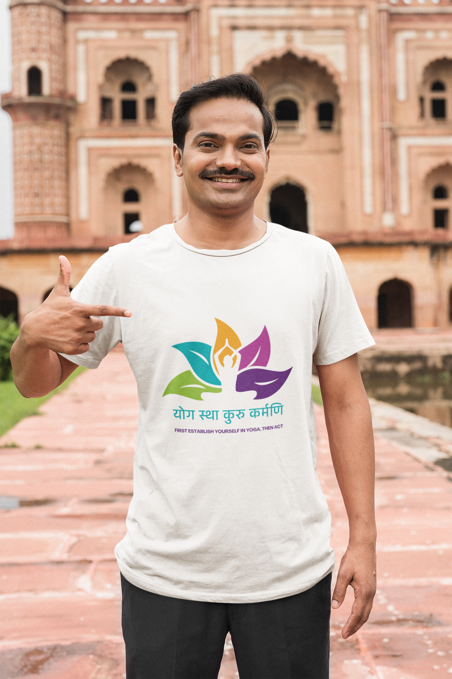 This T-shirt carries one of the most potent teachings of the Gita — योग स्था कुरु कर्मणि (Yogastha Kuru Karmani) — a call to be rooted in inner stillness while engaging fully with the world. For the man who walks the path of presence, this shirt is both reminder and resonance.